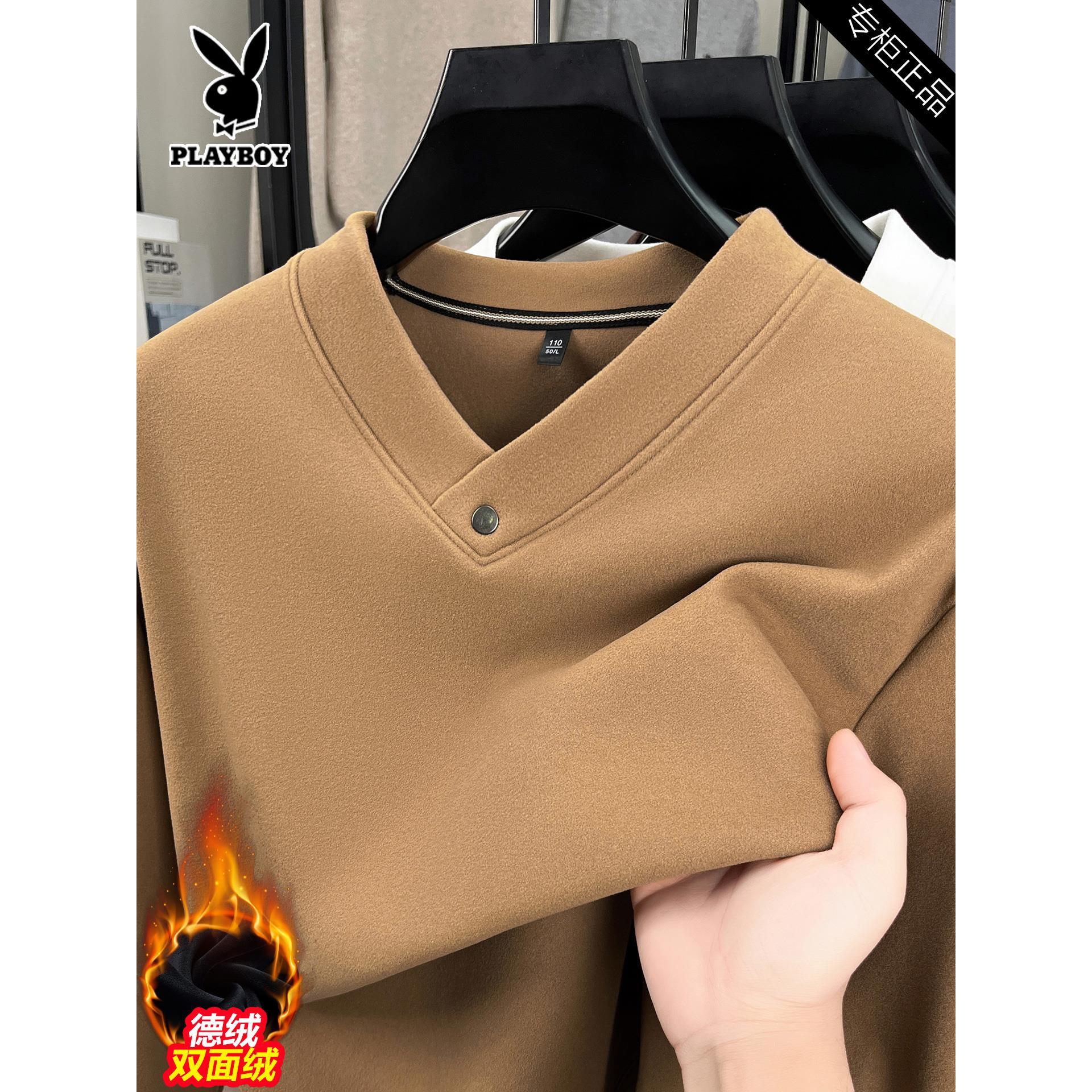 花花公子2025春秋新款高端双面德绒卫衣男长袖T恤V领内搭打底衫潮