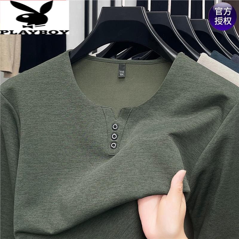 花花公子v领长袖t恤男2023秋季薄款修身打底衫内搭保暖上衣体恤男