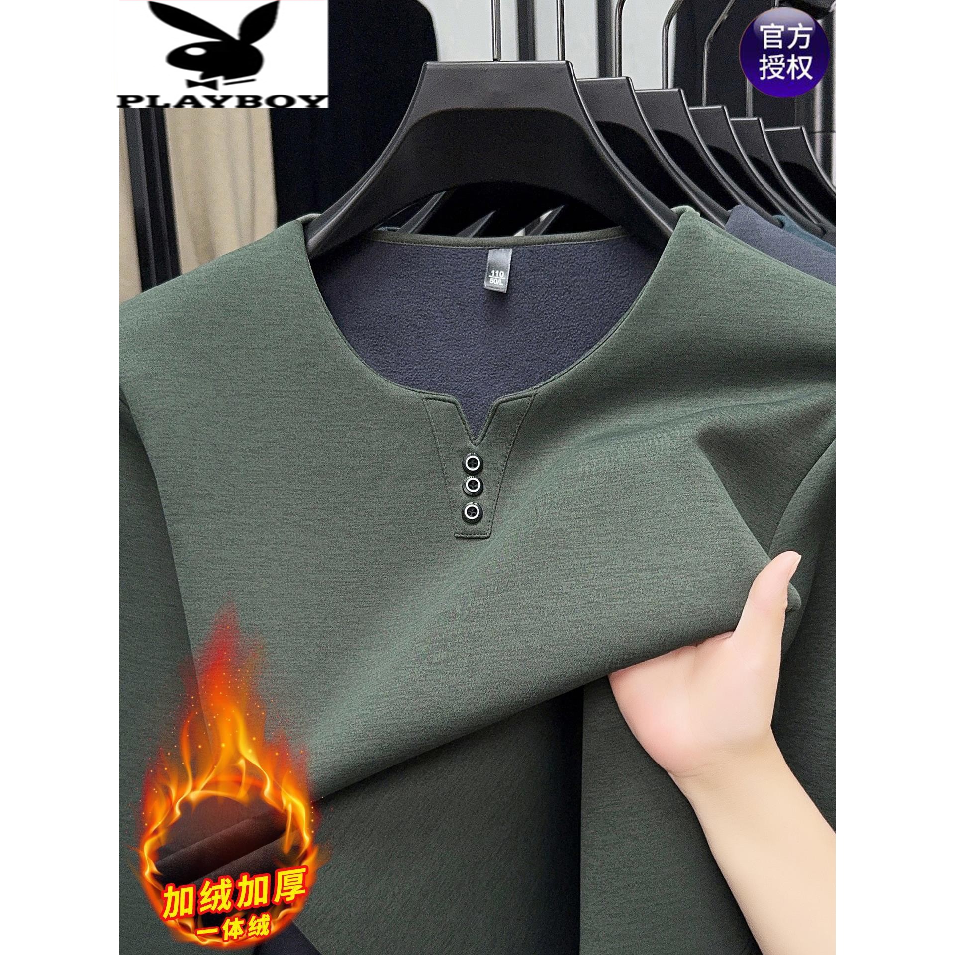 花花公子长袖t恤男V领秋衣秋冬加绒打底保暖内衣上衣纯色加厚卫衣