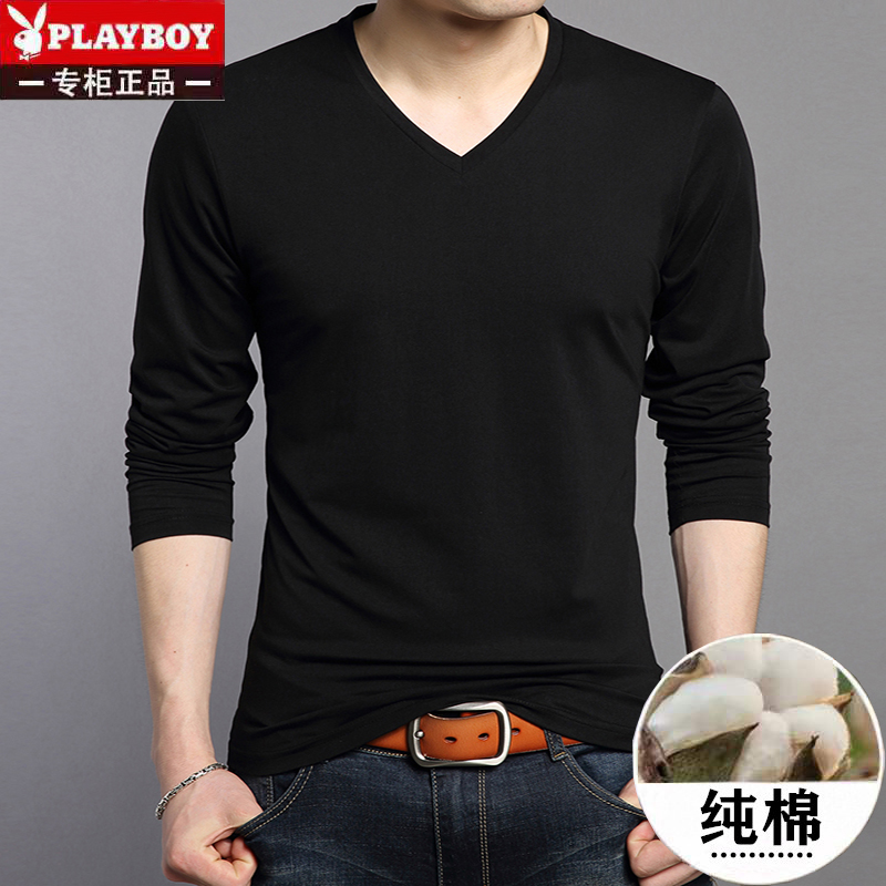 花花公子长袖t恤男士春秋季纯棉V领打底衫修身潮流内搭上衣体恤男
