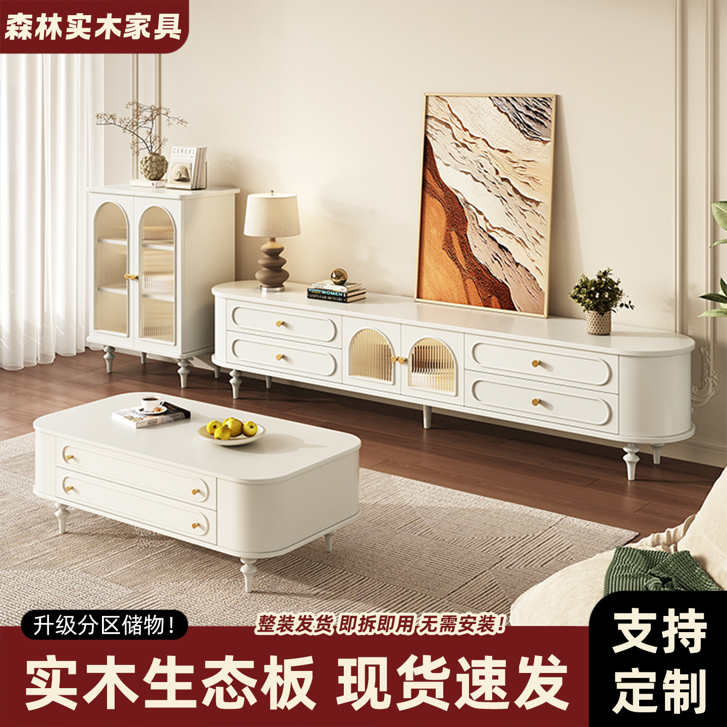 奶油风电视柜茶几组合简约现代法式实木奶白色电视机柜落地柜边柜