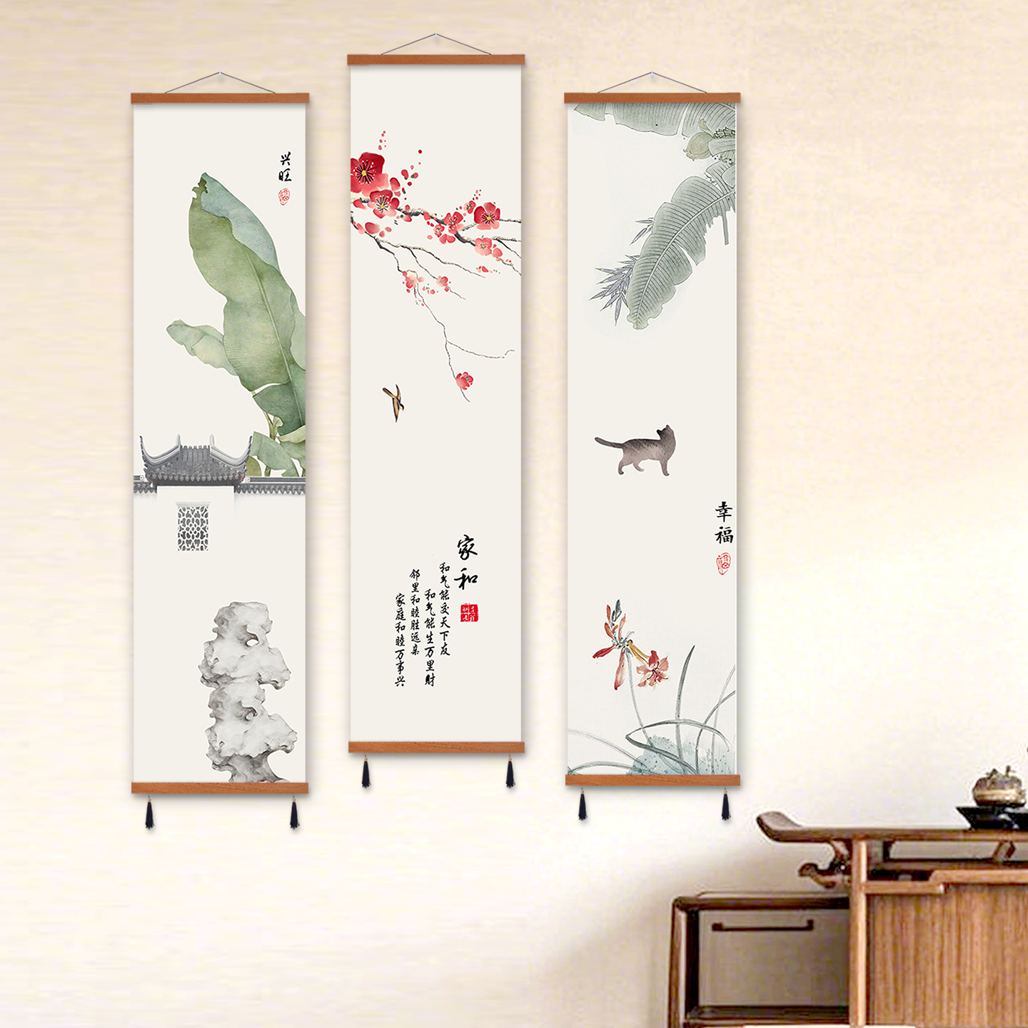 新中式装饰简约餐客厅壁画玄关沙发背景墙挂画书房书法茶室长条画
