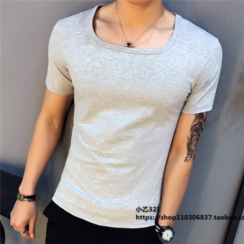 低领短袖t恤男士纯棉修身方领纯色t恤弹力大圆领半袖潮流打底衫男