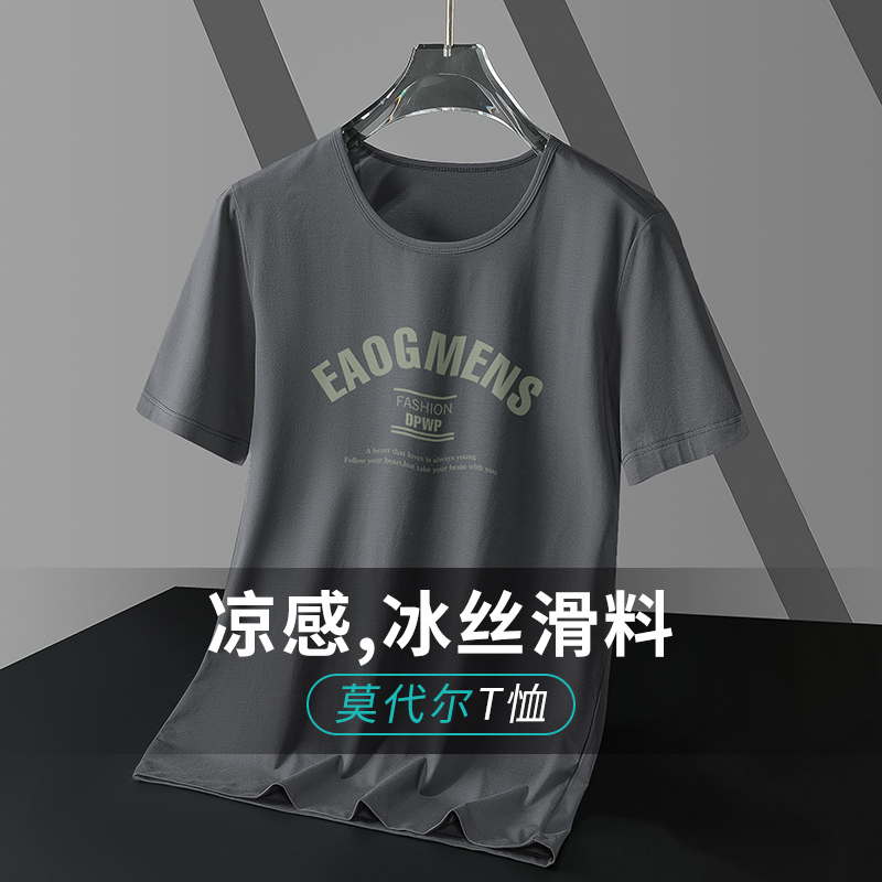 莫代尔短袖t恤男修身潮流圆领上衣服夏季冰丝凉感半袖印花体恤衫