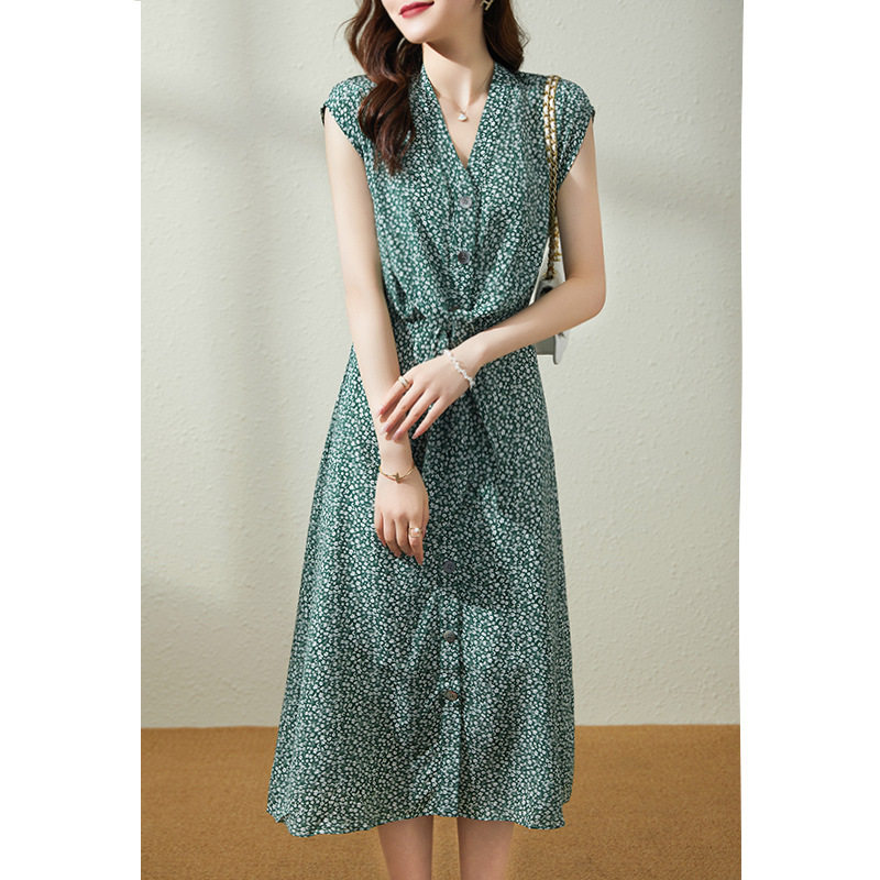 重磅真丝连衣裙桑蚕丝衬衫式碎花裙子夏季印花中长款杭州丝绸女装