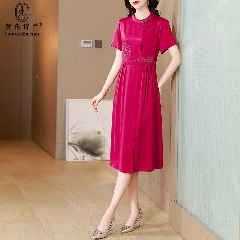 卡若维娅重磅真丝连衣裙女桑蚕丝收腰显瘦中长款短袖妈妈气质裙子