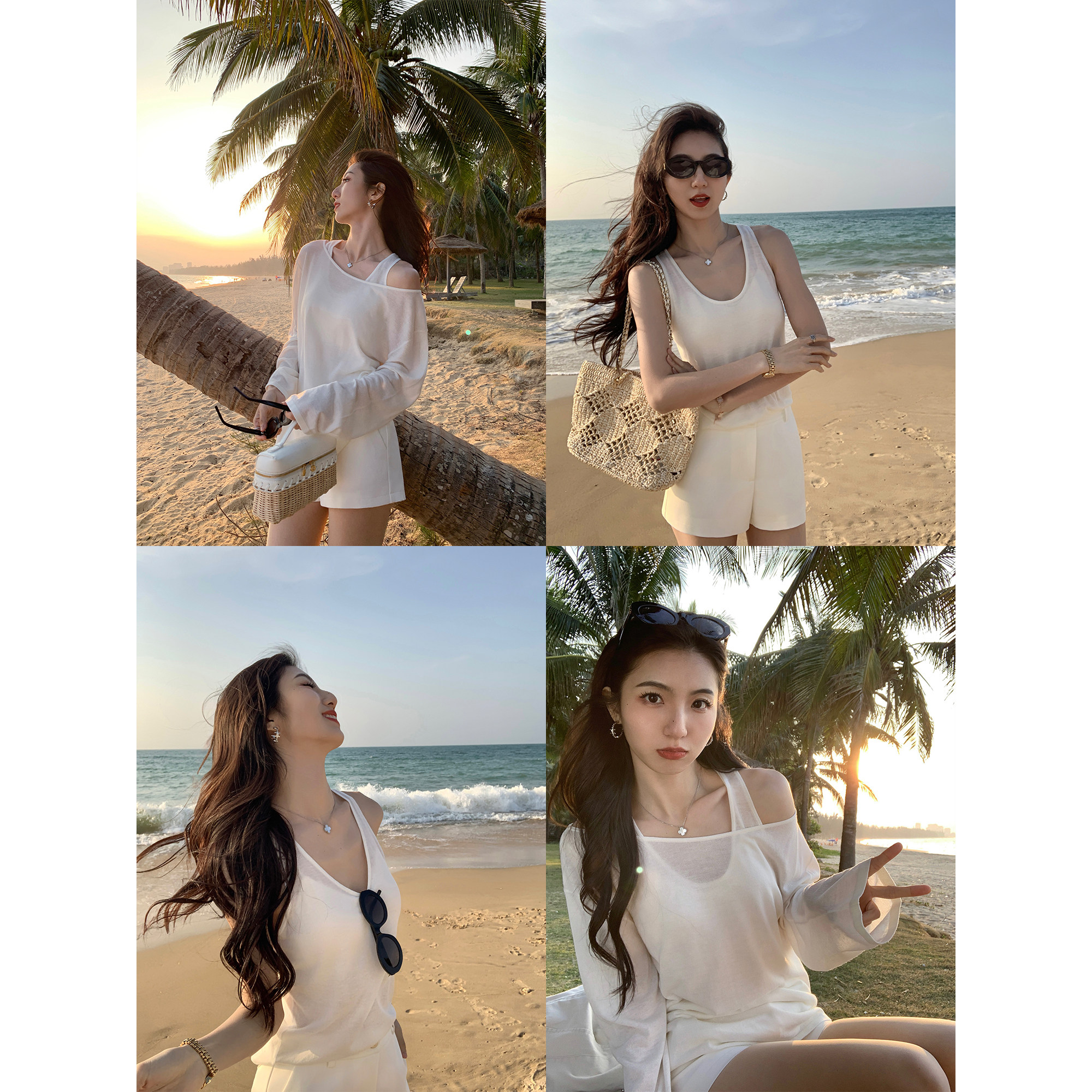 Thas9i九亿 宽松白色微透针织罩衫女亲肤条纹吊带背心短裤套装