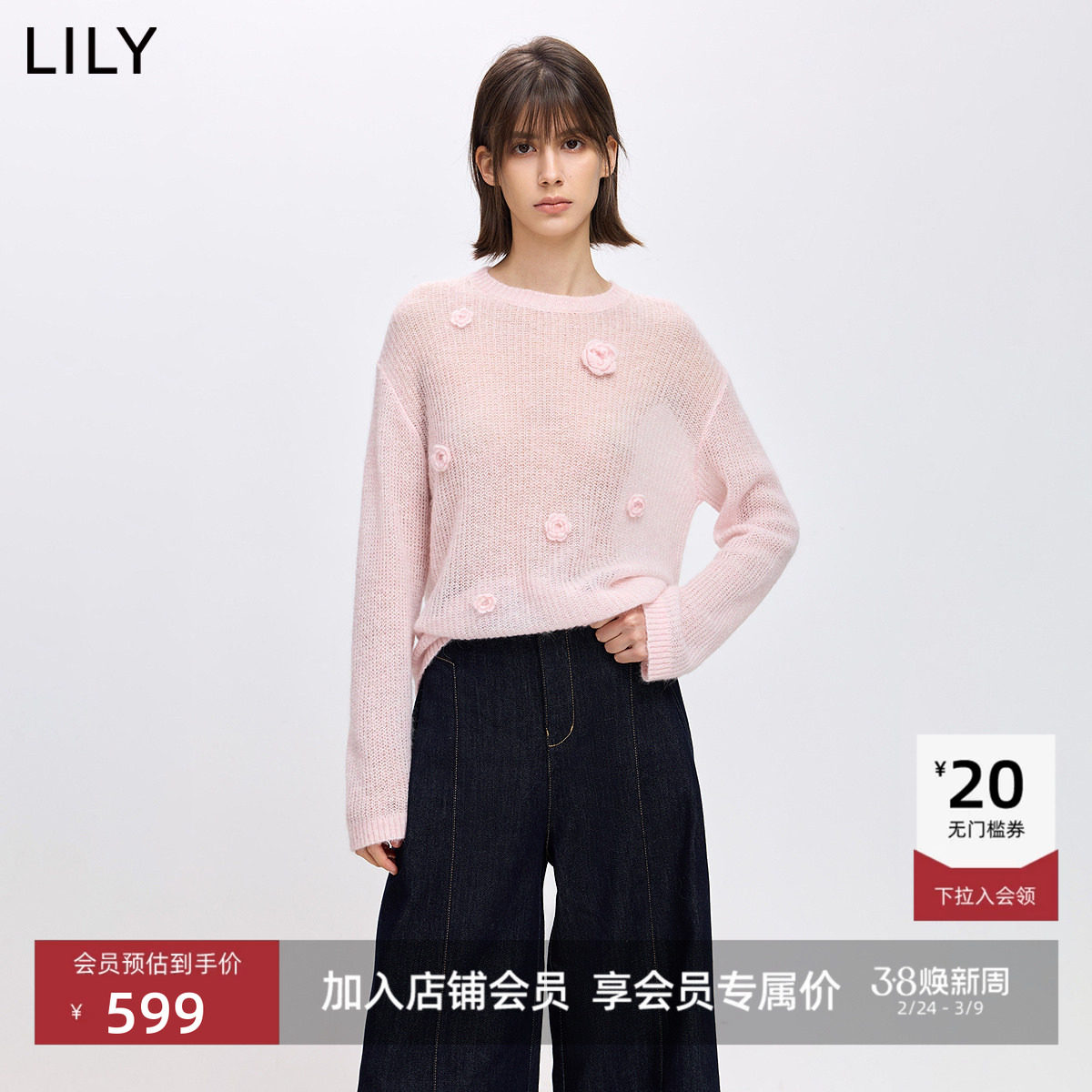 LILY2026春新款女装羊毛上衣薄款罩衫立体花朵浅粉色针织衫毛衣