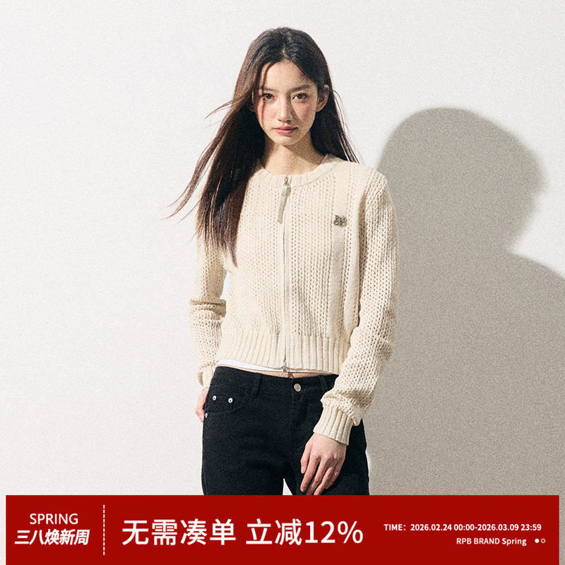 RPB BRAND韩版慵懒风软糯短款针织衫女拉链网眼罩衫开衫毛衣外套