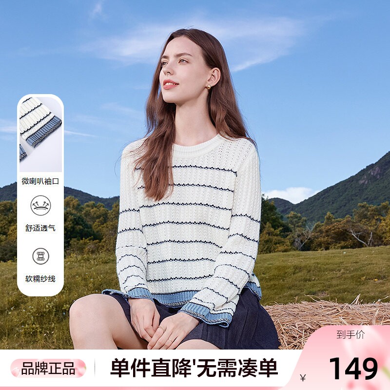 betu百图黑白条纹镂空针织衫女套头2025年秋季新款宽松显瘦罩衫