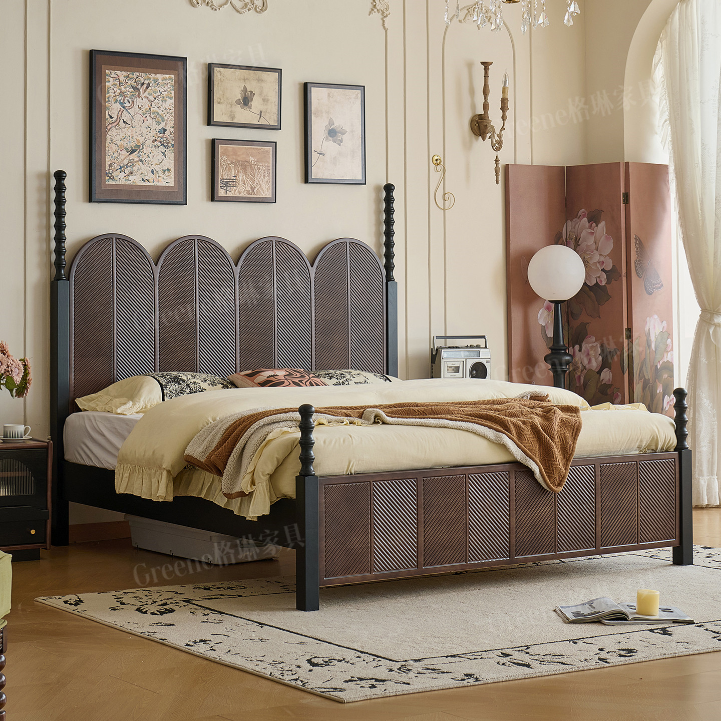 木居盛法式中古实木床美式复古大板床主卧室黑色双人床家用1.8米