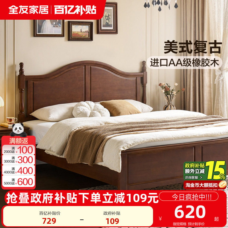 全友家居美式实木床1米8双人床架中古风卧室家具复古风单人床1米5