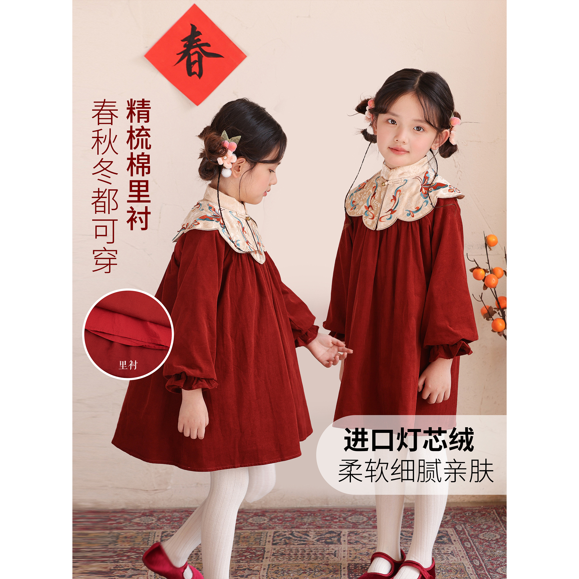 【初煦 高端女童】国风复古红灯芯绒连衣裙 年服裙 重工刺绣云肩