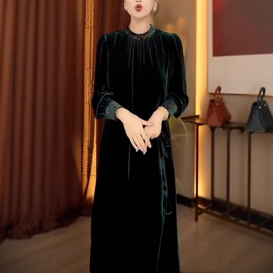高端重工刺绣丝绒连衣裙2025秋冬气质中老年妈妈旗袍宽松打底长裙