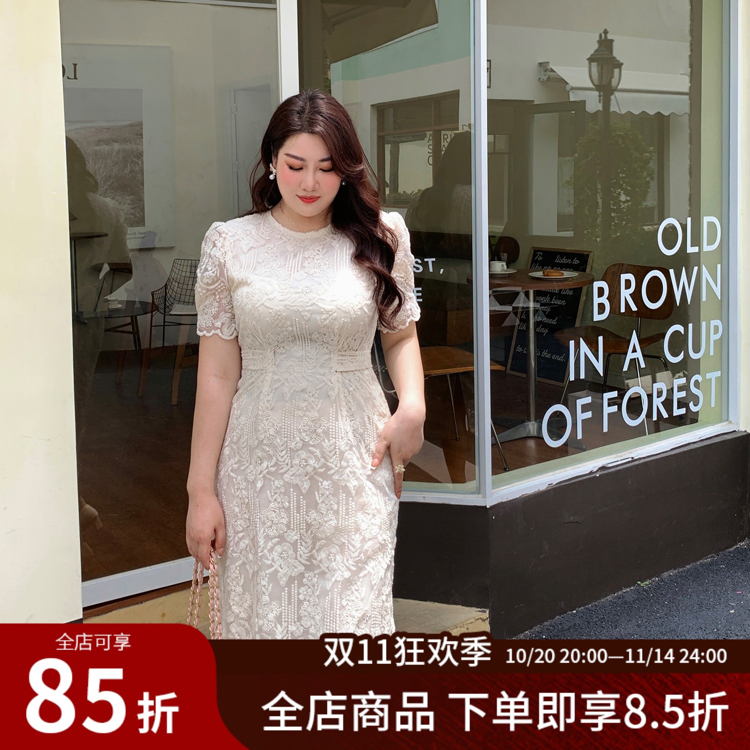 GLEC大码女装高端轻奢款优雅气质重工蕾丝刺绣连衣裙胖mm遮肚显瘦