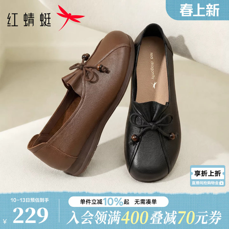 红蜻蜓皮鞋女妈妈鞋新款女鞋舒适平底乐福单鞋真皮软底中老年鞋子