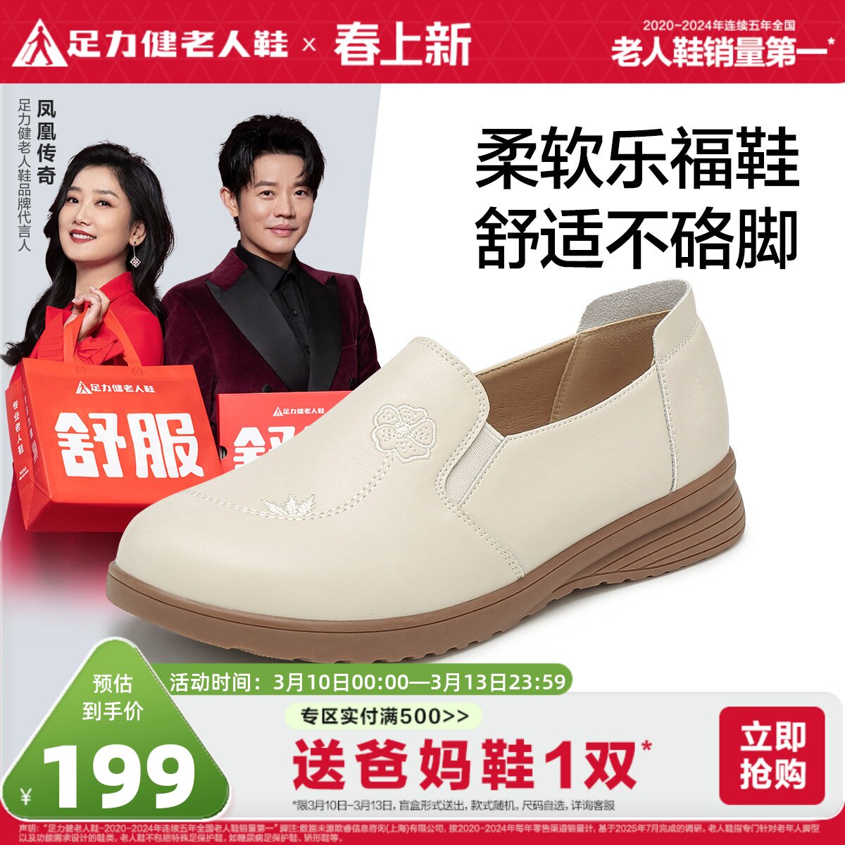 足力健妈妈鞋中老年舒适不累脚小皮鞋一脚蹬女春季单鞋软底平底鞋