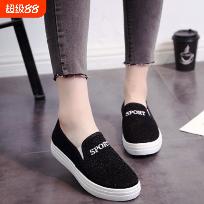 春秋平底一脚蹬懒人鞋休闲帆布鞋平跟布鞋厚底女鞋板鞋单鞋白黑色