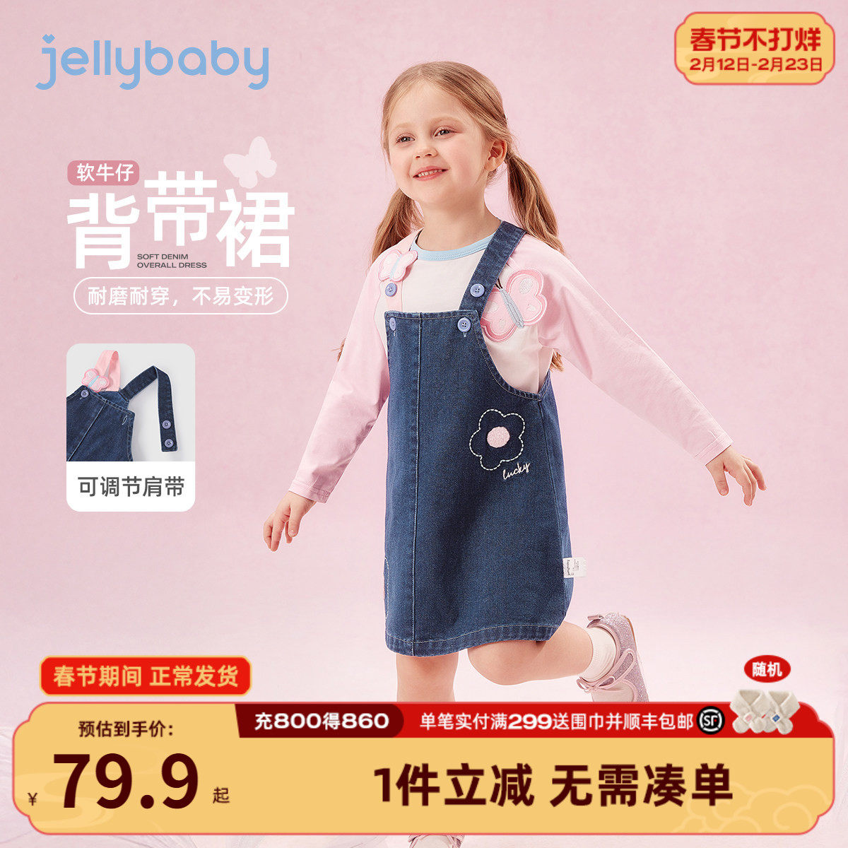 [7A抑菌]女童牛仔裙早春儿童蝴蝶背带裙宝宝春装裙子女孩春季衣服