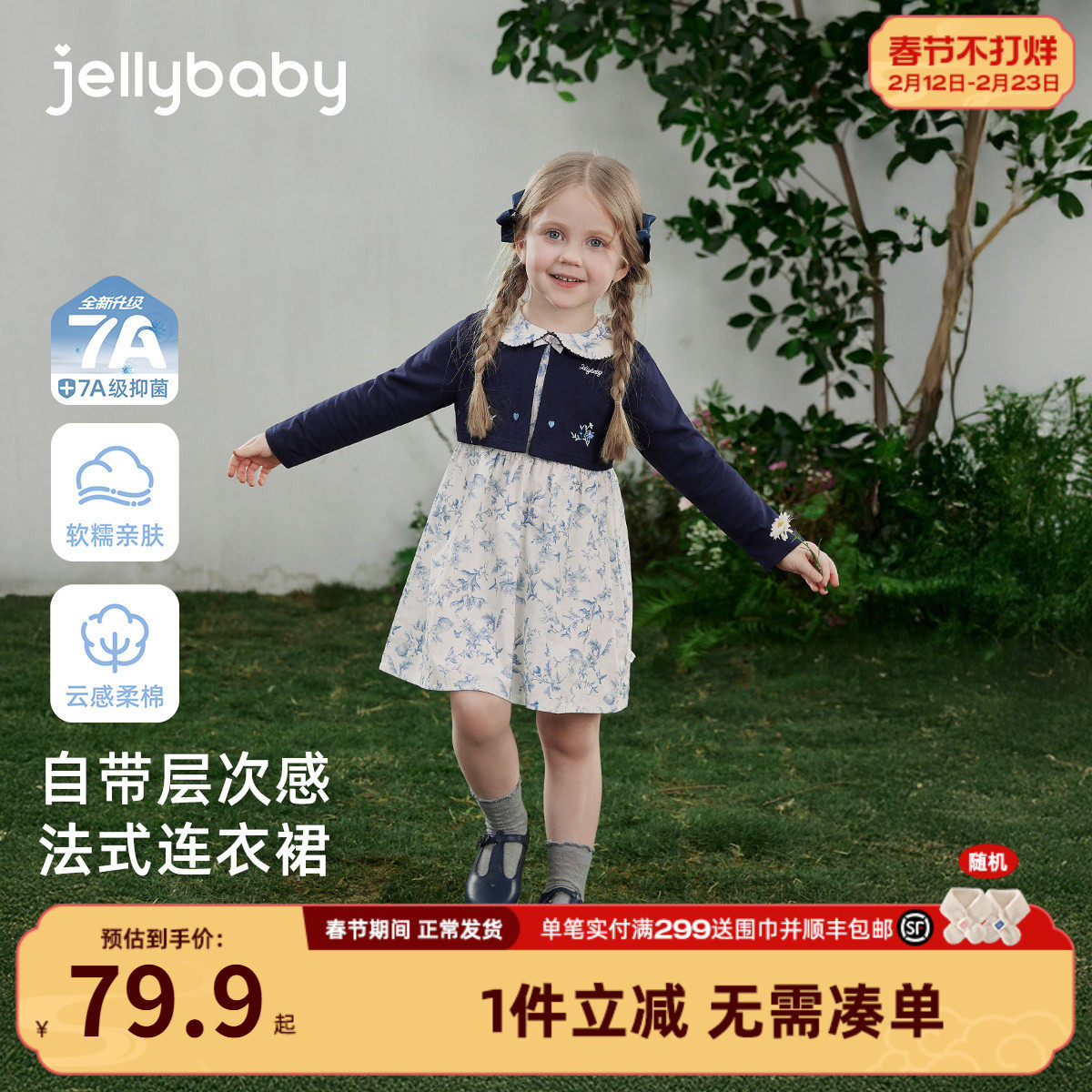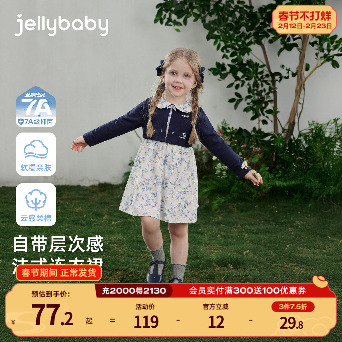 [7A抑菌]女童纯棉连衣裙春季儿童法式翻领印花假两件宝宝春装裙子