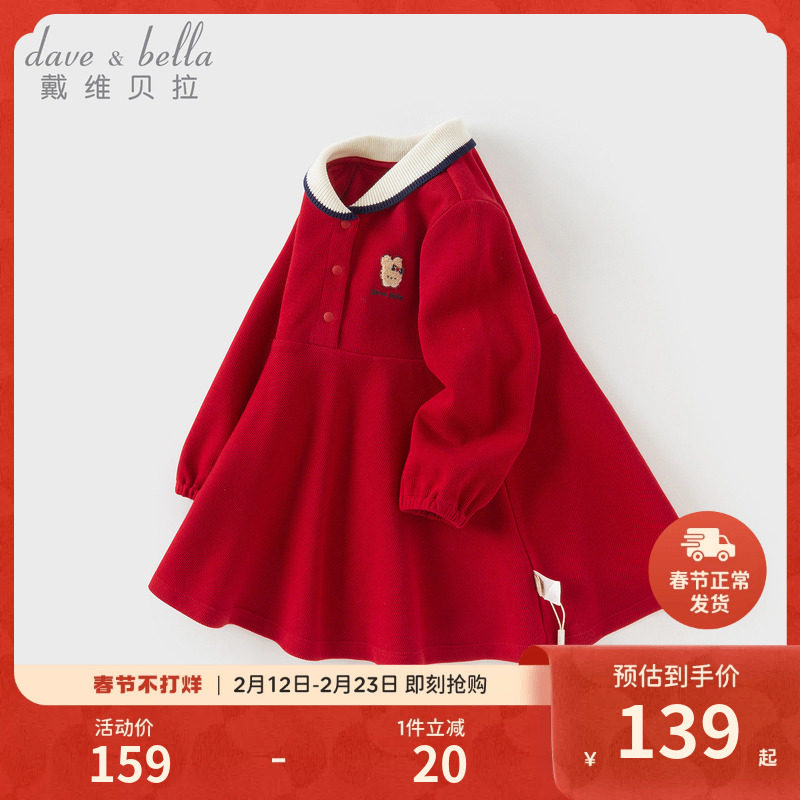 戴维贝拉女童连衣裙春装儿童红色新年公主裙周岁宝宝礼服裙子童装