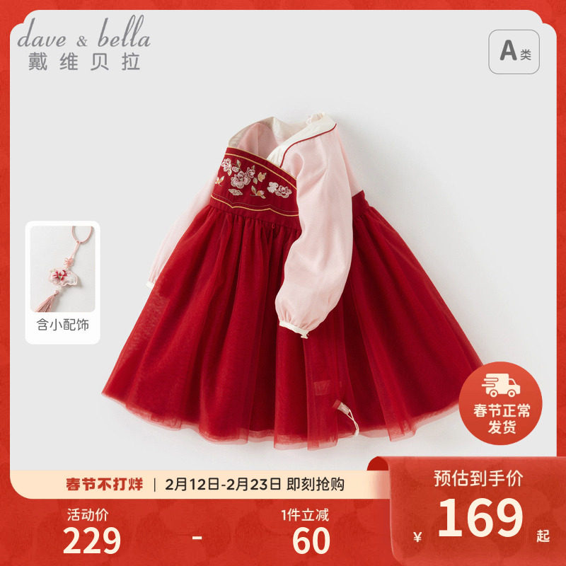 戴维贝拉女童国风连衣裙春装新款儿童网纱裙周岁宝宝红色新年裙子
