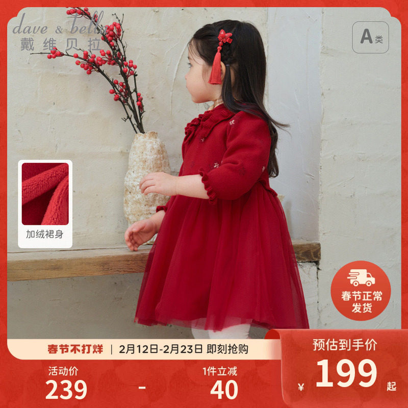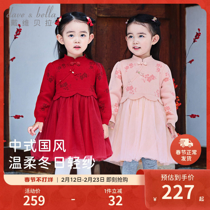 戴维贝拉女童毛衣连衣裙春装加绒针织裙儿童宝宝国风新年裙子童装