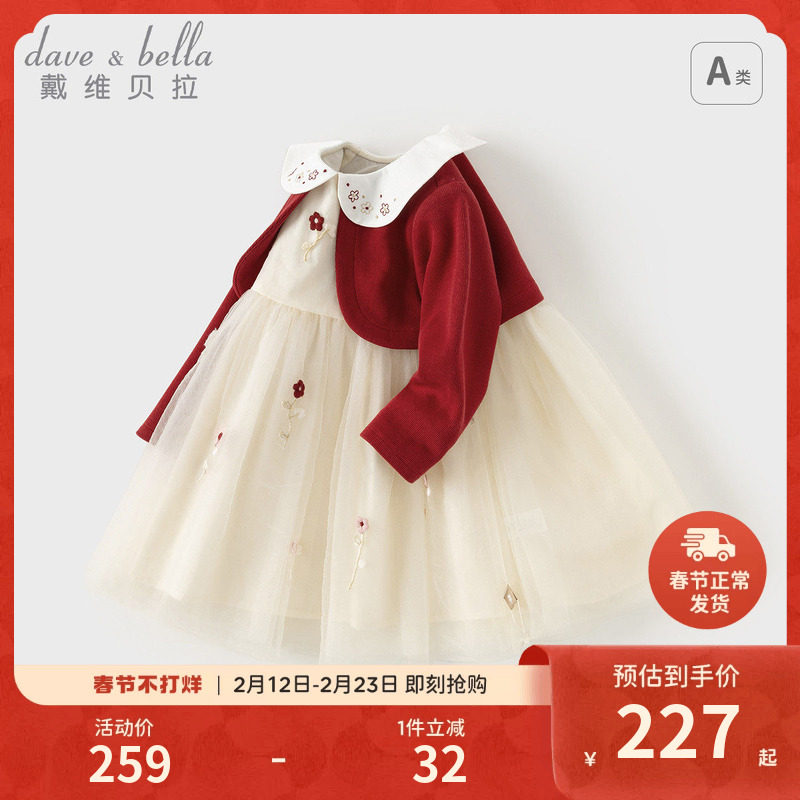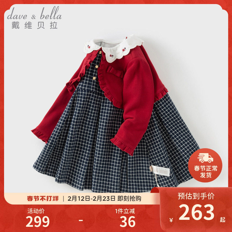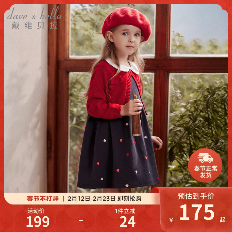 戴维贝拉女童连衣裙春装新款针织裙子儿童宝宝新年红色公主裙童装