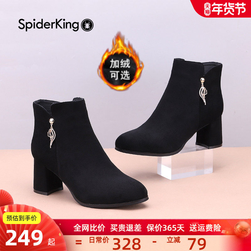 蜘蛛王加绒小短靴绒面女鞋冬季新款保暖磨砂女靴粗跟高跟鞋踝靴子