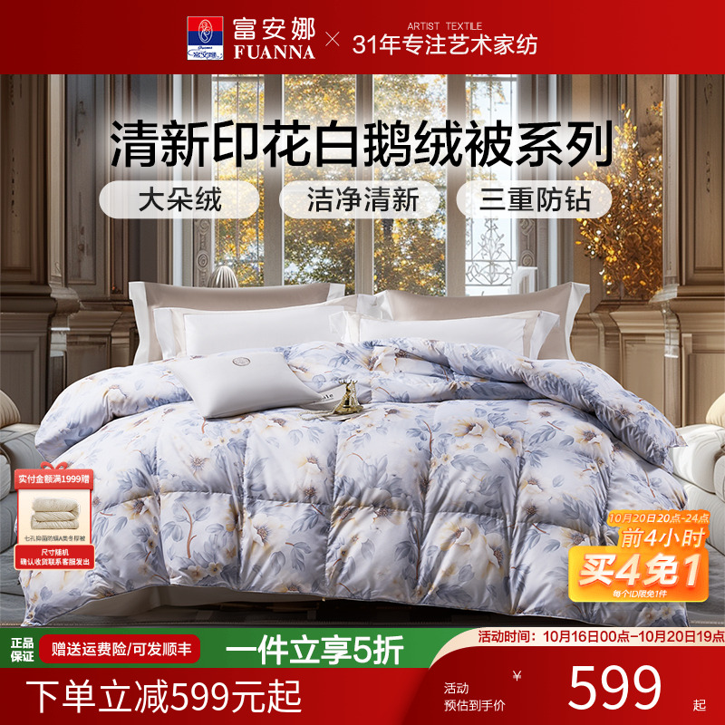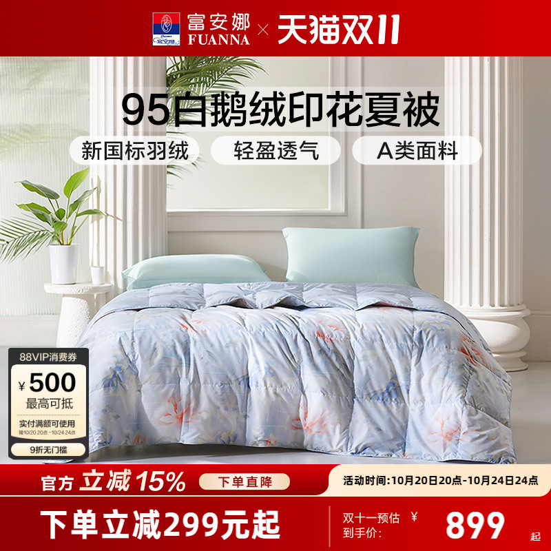 富安娜白鹅绒被95鹅绒被芯夏被空调被四季通用被印花被芯双人1.8m