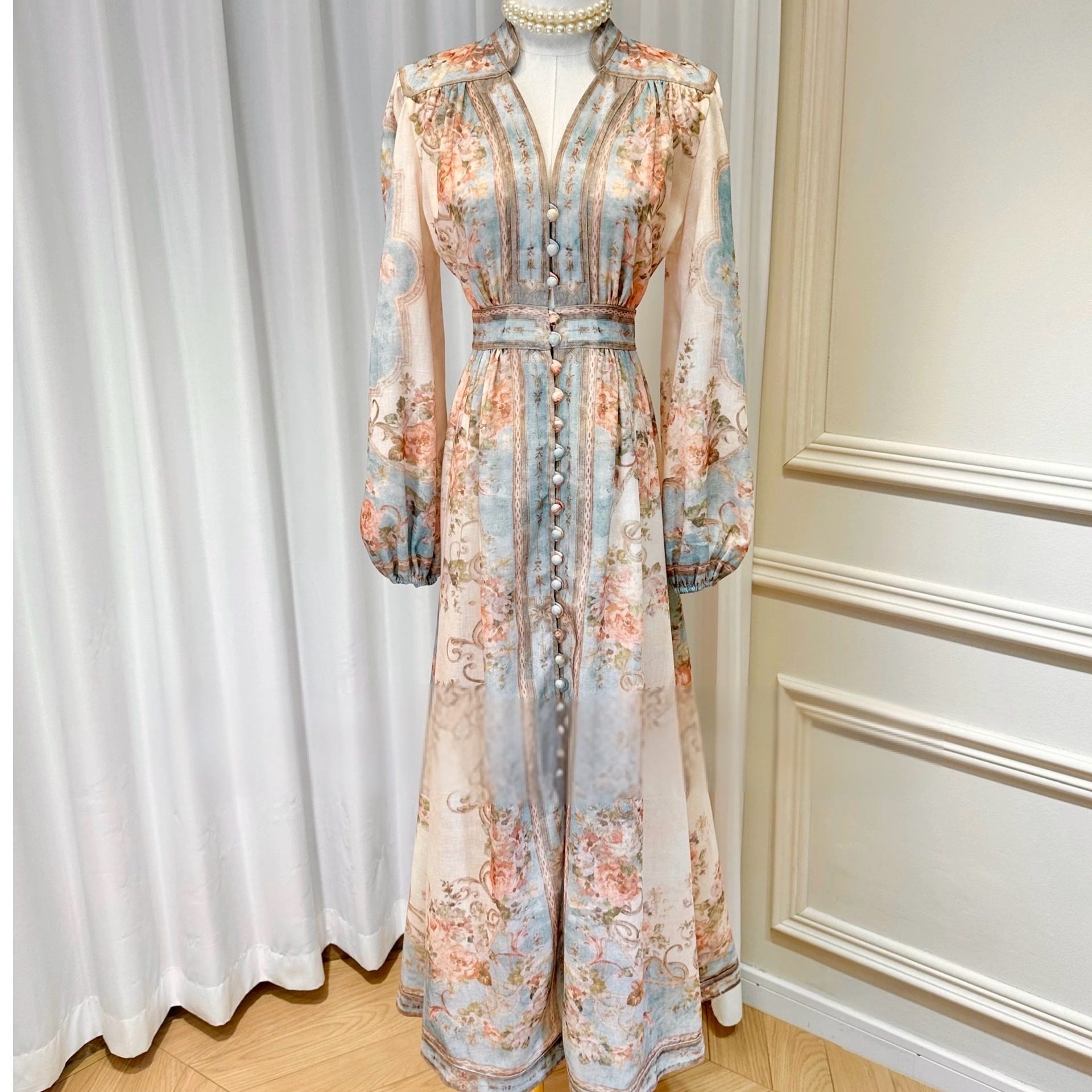 复古印花显气质V领单排扣泡泡袖收腰开叉长裙真丝桑蚕丝连衣裙女