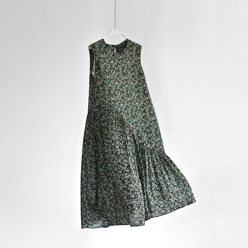 三亚度假薄荷曼波 碎花100真丝桑蚕丝连衣裙女中长款不规则海边绿