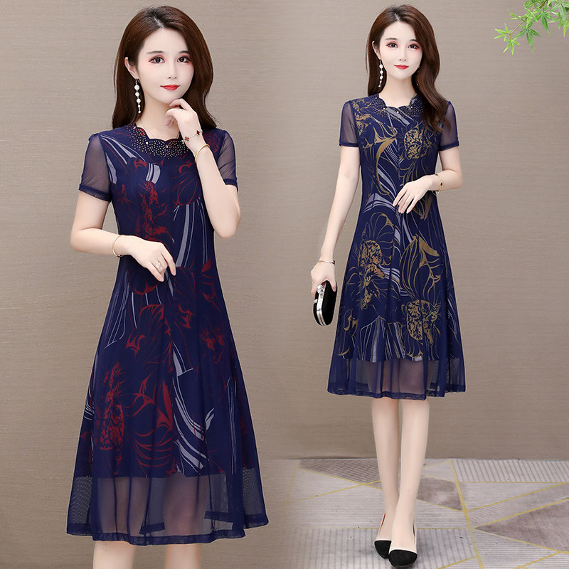 年轻妈妈连衣裙中年短袖气质显瘦网纱40岁50中老年女夏装洋气裙子