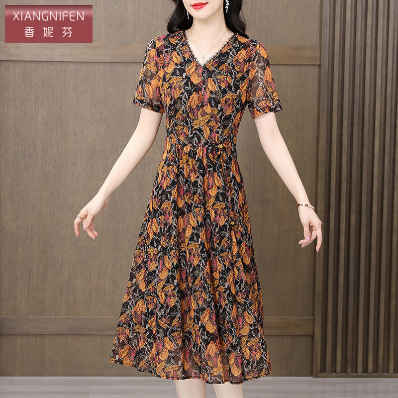 菲梦伊高贵洋气印花连衣裙女短袖夏季复古显年轻收腰妈妈大码裙子