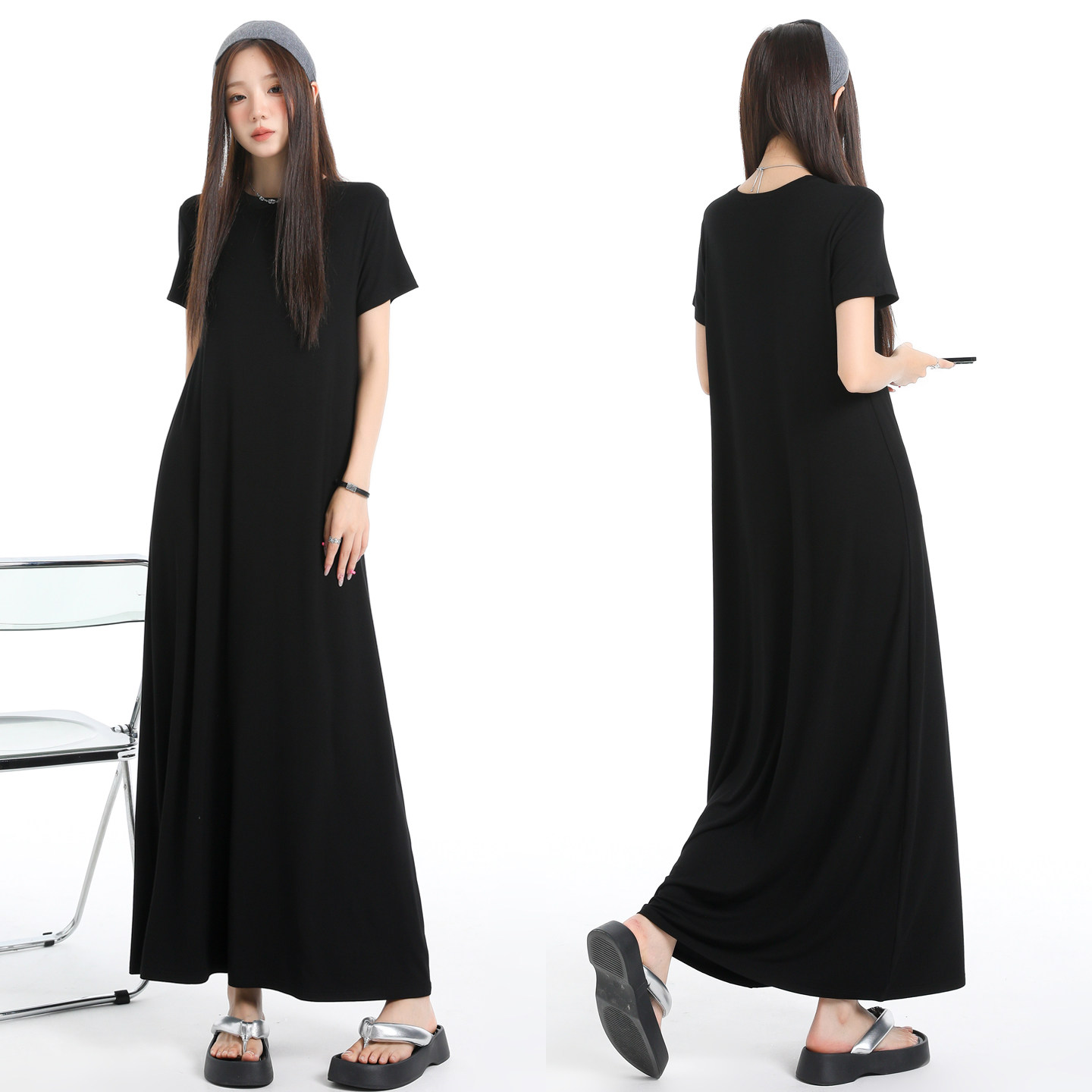 - 短袖雪纺连衣裙长款