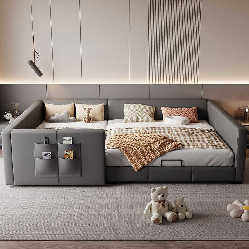 现代简约二胎家庭亲子床一家四口拼接子母床榻榻米加高护栏皮艺床