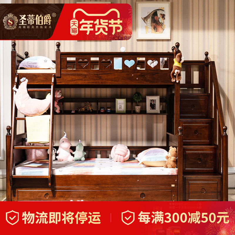 美式实木卧室儿童床母子复古高低床上下成人高低床两层二胎亲子床