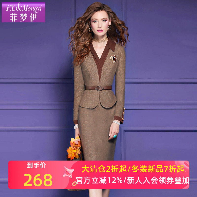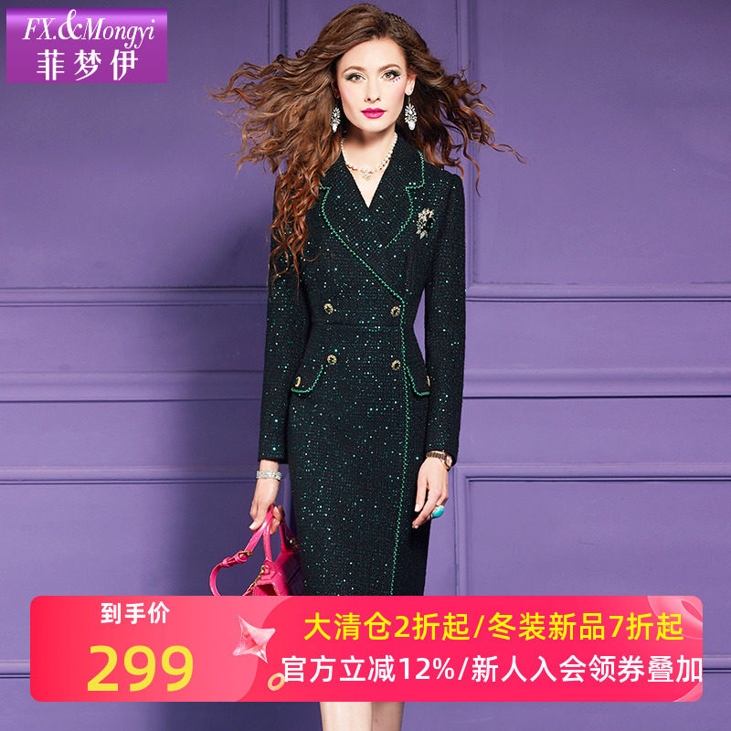 菲梦伊亮片西装连衣裙女秋季高端加厚粗花呢复古修身气质职业裙子