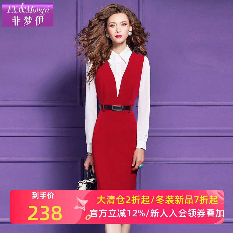菲梦伊假两件衬衫连衣裙女秋季高级感通勤气质拼接修身职业一步裙