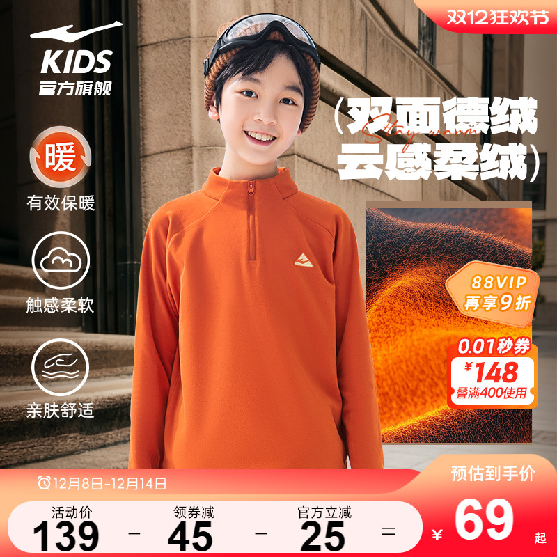 鸿星尔克童装男童长袖t恤加绒儿童半拉链卫衣秋冬保暖针织打底衫