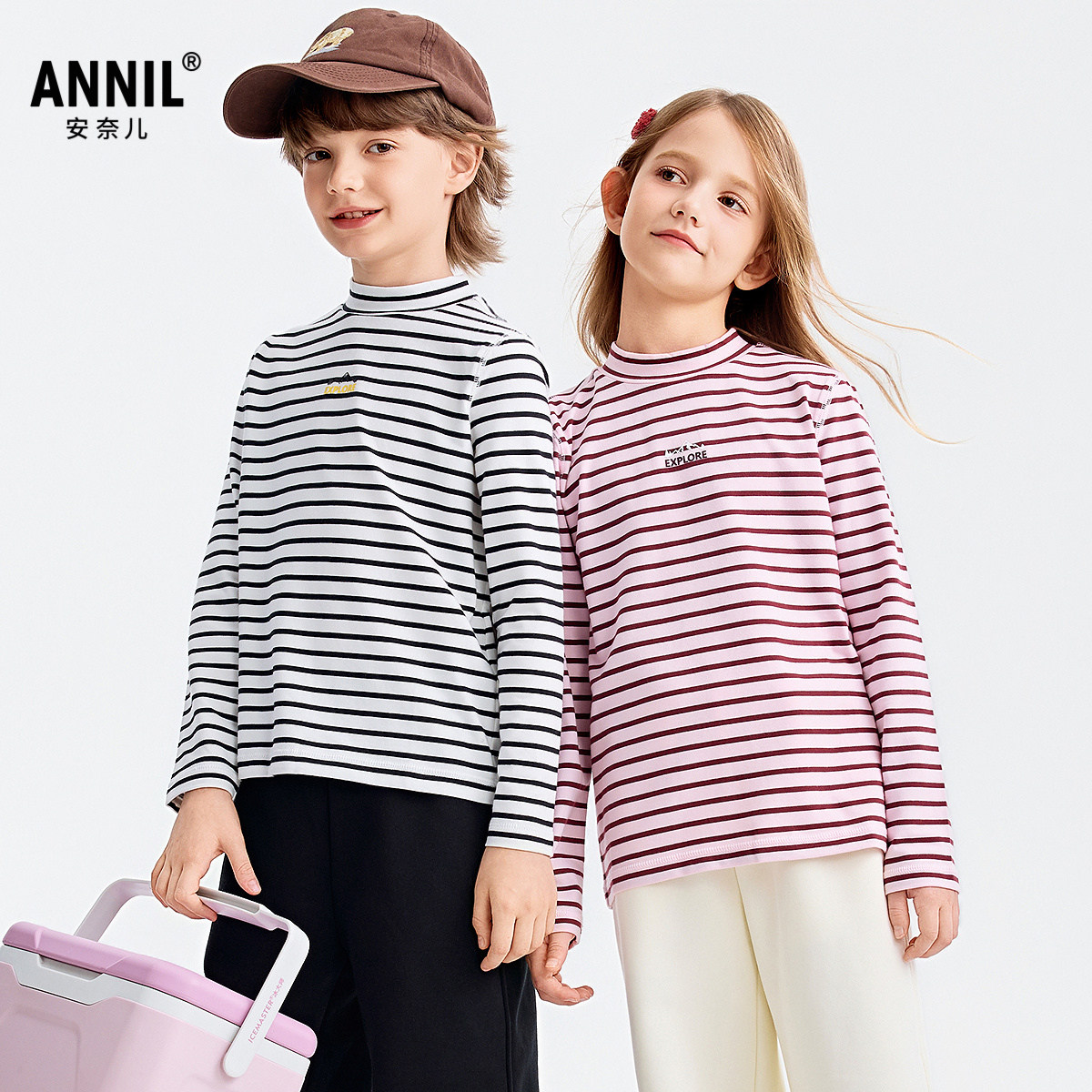 安奈儿男女童中领长袖针织T恤2025秋条纹打底衫亲肤外穿上衣撞色