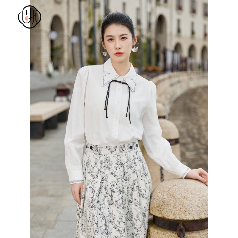 LLANO法式绑带刺绣衬衫复古荷叶领泡泡灯笼袖外搭上衣衬衣女秋季