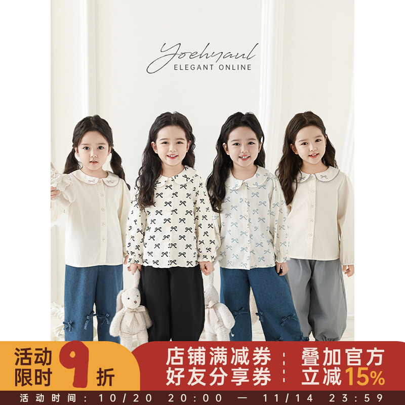 幼悠女童蝴蝶结刺绣印花娃娃领衬衫春季甜美乖巧小泡泡袖休闲上衣
