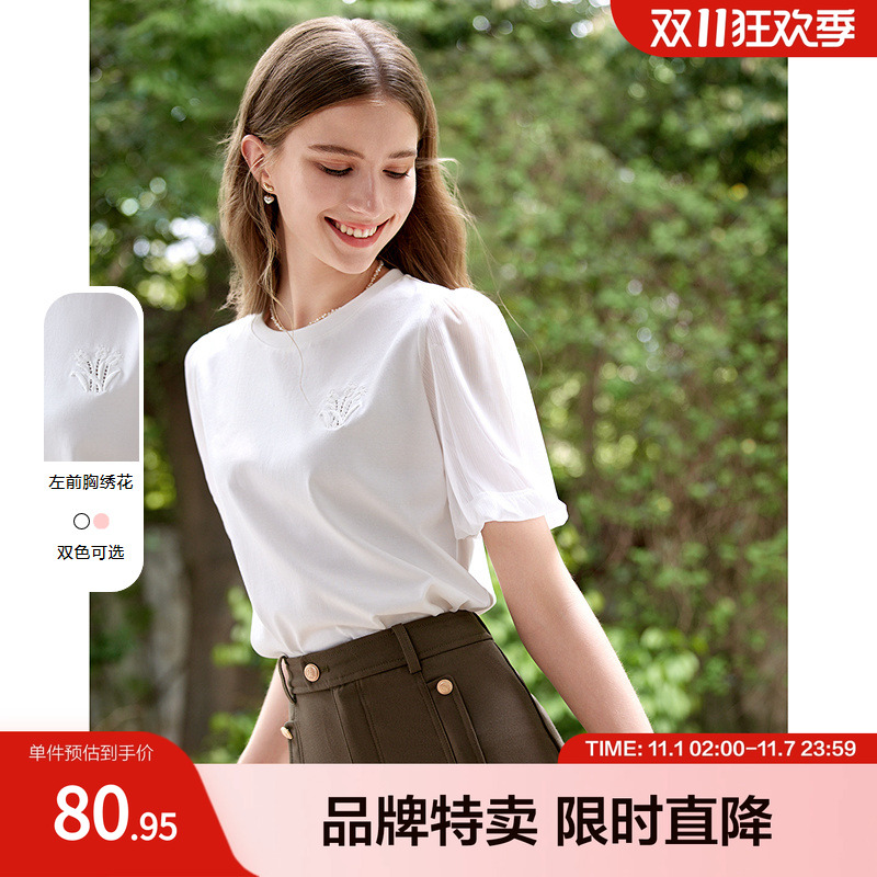 白色短袖T恤女夏季法式重工刺绣衬衫甜美减龄泡泡袖花边圆领小衫