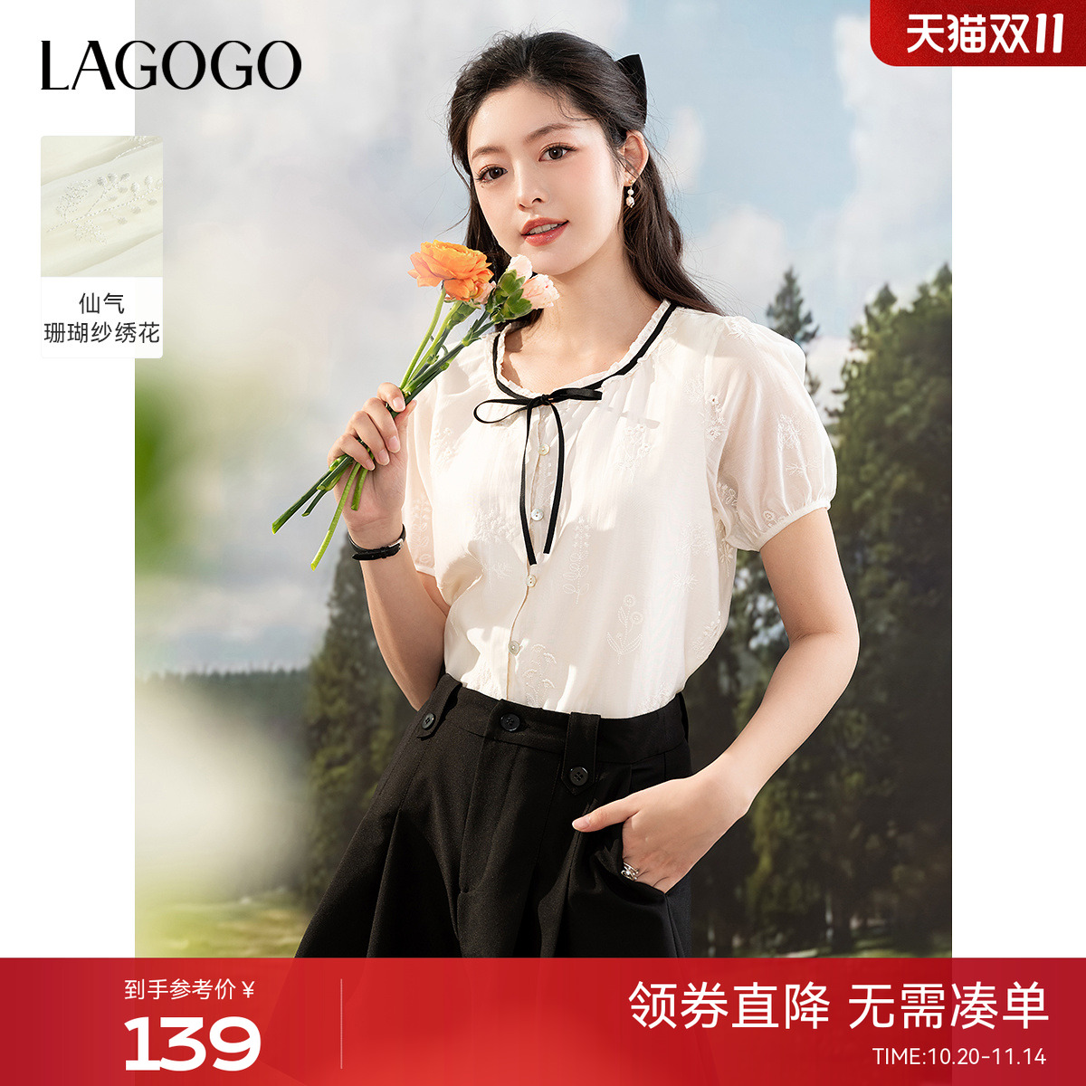 LAGOGO绣花泡泡袖短袖衬衫女拉谷谷2025年夏秋季新款甜美法式上衣