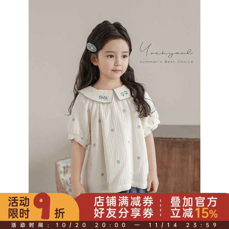允儿妈女童夏季新款韩系纯棉刺绣泡泡袖短袖宝宝洋气娃娃衫衬衫潮