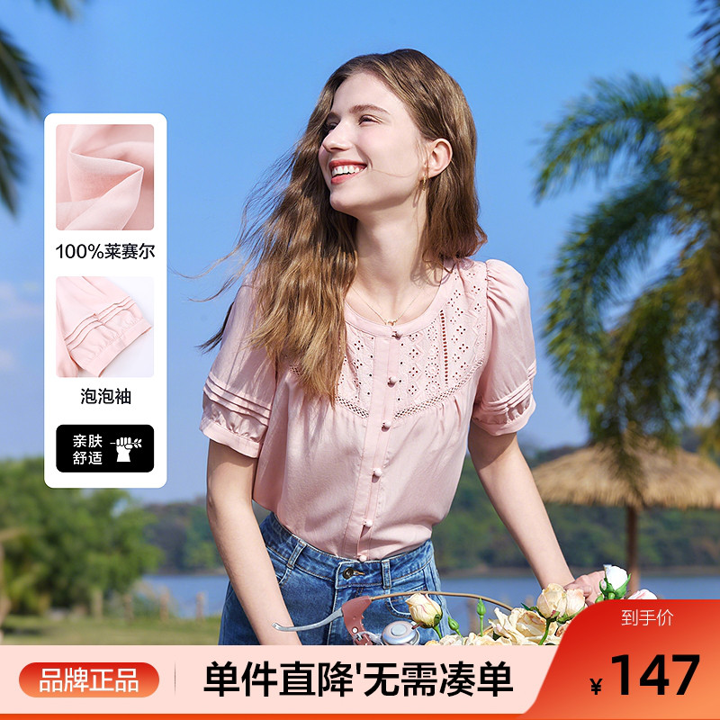 betu百图粉色莱赛尔泡泡袖绣花衬衫女2025年夏季新款小个子衬衣