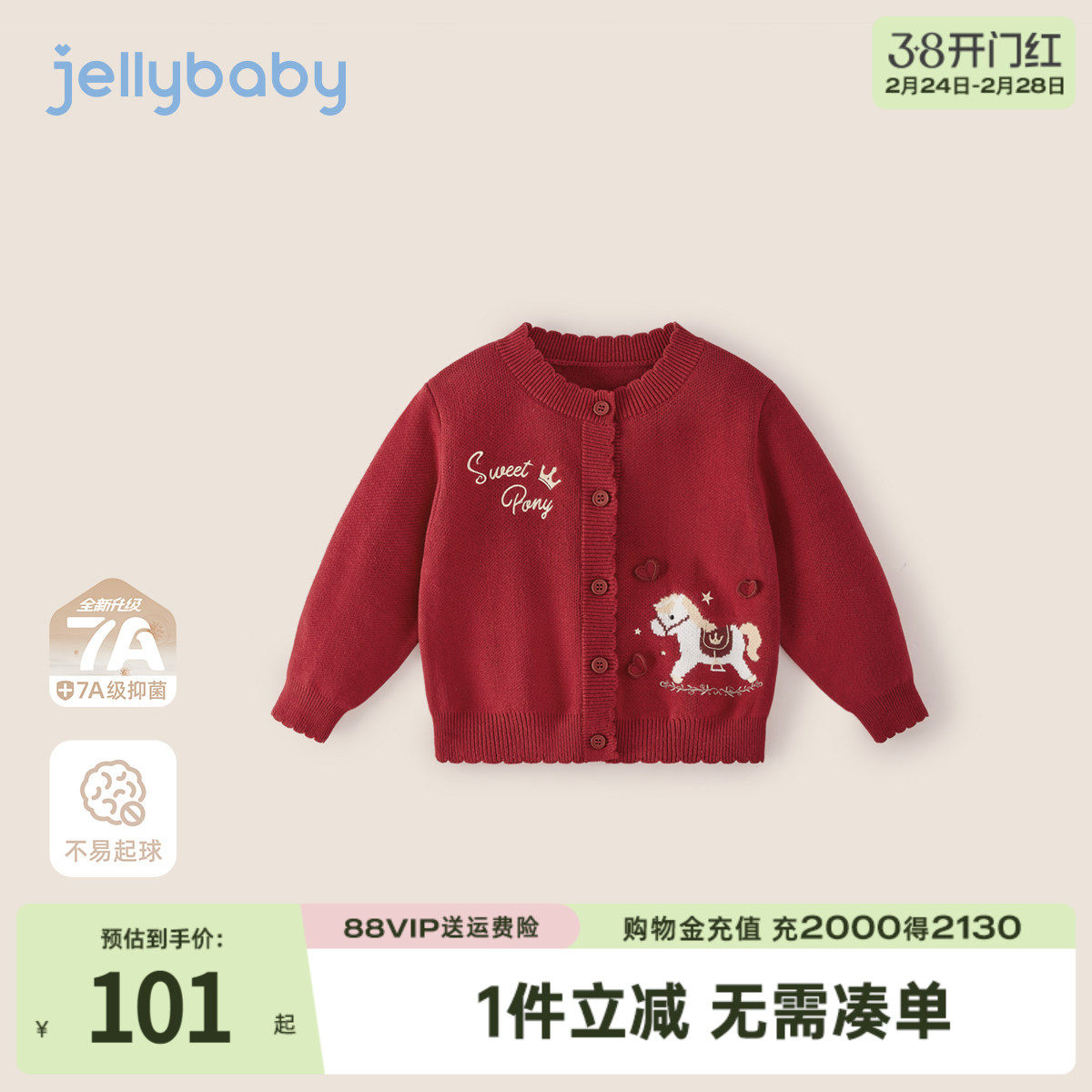 布丁哈鲁拜年服红色小马针织开衫2026春季女童装毛衣外套毛衫上衣