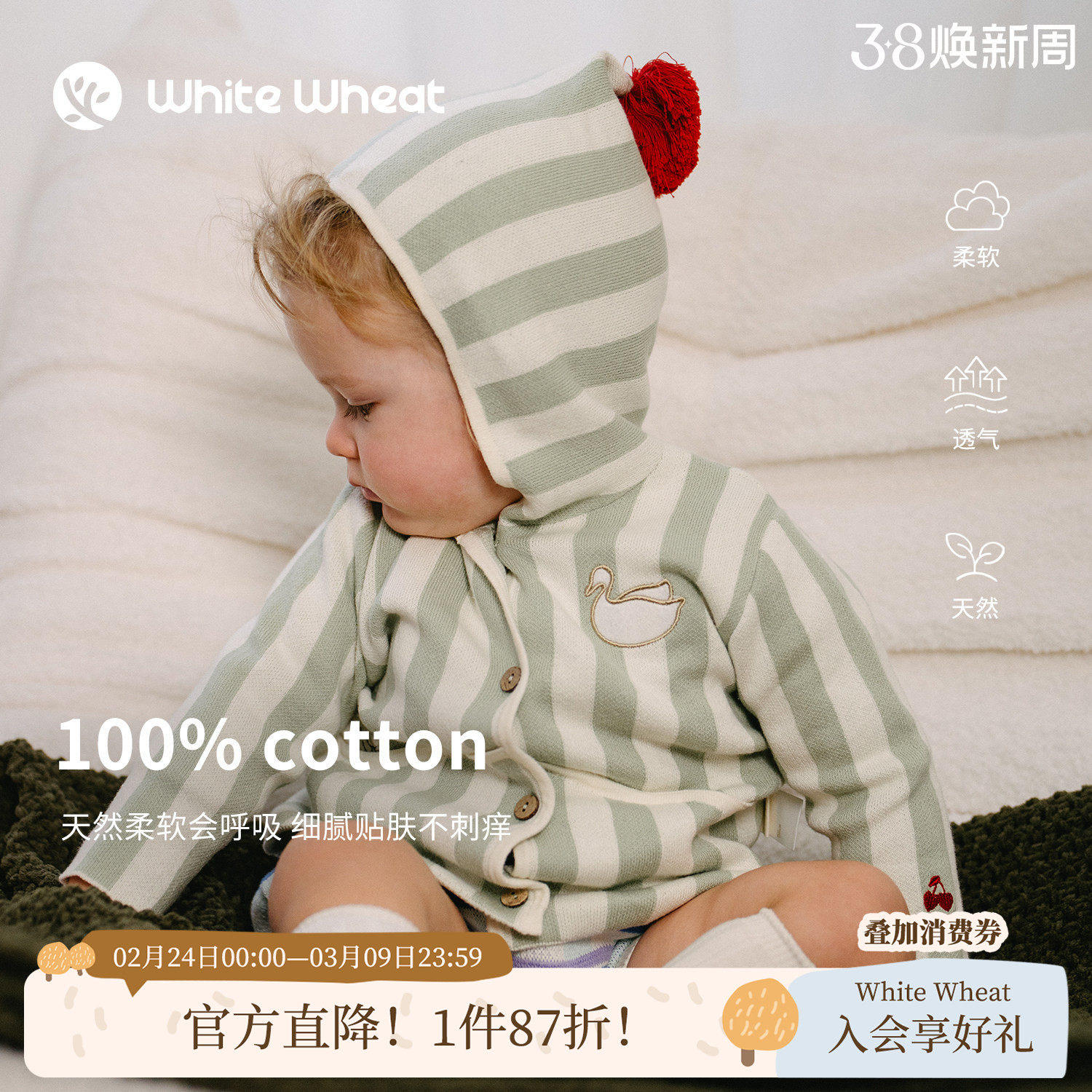 whitewheat儿童26春季新款开衫外套男女童休闲纯棉毛衣连帽针织衫