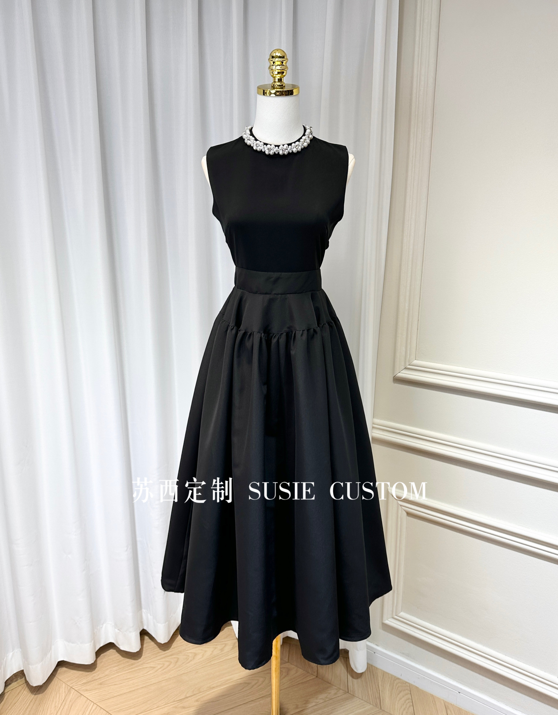 复古高级赫本显气质珍珠水钻领口无袖背心收腰大摆蓬蓬裙摆连衣裙